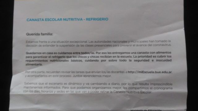 No obstante, junto con el bolsón de alimentos, el Gobierno de la Ciudad de Buenos Aires les hace llegar a las familias una nota con membrete, sin firma, donde asegura que la prioridad es cubir los requerimientos nutricionales básicos, cuidando por sobre todo la seguridad e inocuidad alimentaria”. -Sic, debiera decir “alimentarias, teniendo en cuenta que, aún sin firma, lleva el membrete del Ministerio de Educación.