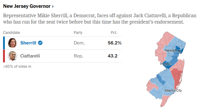 En New Jersey, la actual diputada Mickey Sherrill ganó por 400.000 votos de diferencia con el candidato Republicano, esto es el 56.2% de los votos. Lo cierto es que en este Estado hay una diferencia de 850.000 demócratas registrados más que republicanos. Kamala Harris ganó por 250.000 votos frente a Trump, lo que representa un porcentaje menor que en las elecciones presidenciales entre Biden y Trump. Esto presentaba dudas a la hora de determinar cuán acertadas eran las encuestas, que oscilaban entre el 1 al 9% y la mostraban como ganadora a Sherrill.