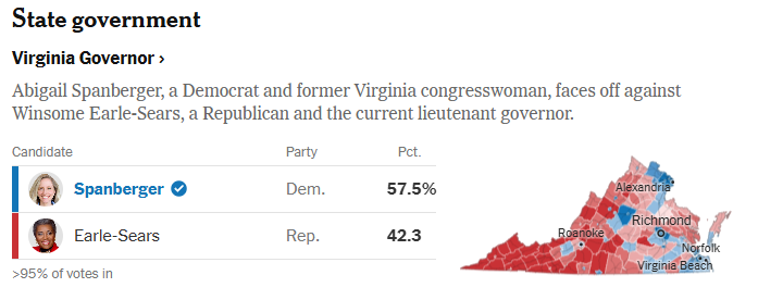 Por su parte, Spanberger, de 46 años, también actual diputada por el estado de Virginia, se convertirá en la primera gobernadora mujer del Estado. Le ganó las elecciones a otra mujer del partido republicano, cuyas propagandas televisivas estaban llenas de insultos y exageraciones. Comparado con New Jersey, el Estado de Virginia contiene a una población con tendencias más conservadoras.