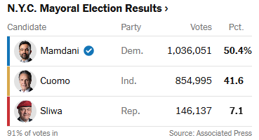 El candidato para la alcaldía por el Partido Demócrata que proviene del ala más izquierda del mismo (Demócratas Socialistas de América), Zohran Mamdani, de 34 años, ganó con el 50. 4% de los votos. Además de haber hecho una campaña magnífica en redes sociales, y de contar con un batallón de jóvenes voluntarios que no pararon de tocar puertas para motivar a la gente a votar por su candidato hasta dos días antes de las elecciones, se benefició de tener dos pobres contrincantes. El democrata y ex gobernador de New York con 13 denuncias de acoso sexual, entre otros escandalos, y que por eso motivo tuvo que renunciar al cargo; y un republicano que no sacó mas que el 8% de los votos. Con el triunfo de Mamdani, el Partido Demócrata, que hasta ahora ha privilegiado a candidatos centristas y se ha rehusado a “abrir la carpa” e incluir a una nueva generación con ideas más socialistas, se verá obligado a hacerlo.